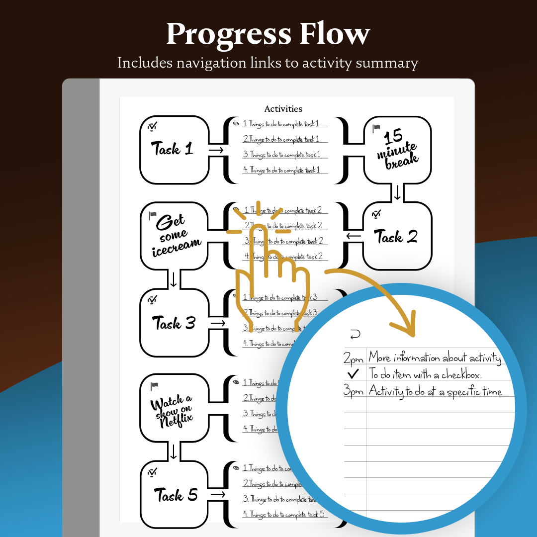 Our Progress Flow planner offers the perfect combination of productive tasks and rewarding moments. View your project list from a high-level perspective and navigate the task flow screen with a detailed summary. Experience the joy of crossing items off your list and the satisfaction of achieving your goals - with Progress Flow. Overcome ADHD in a fun, motivating way by regaining control of your objectives.