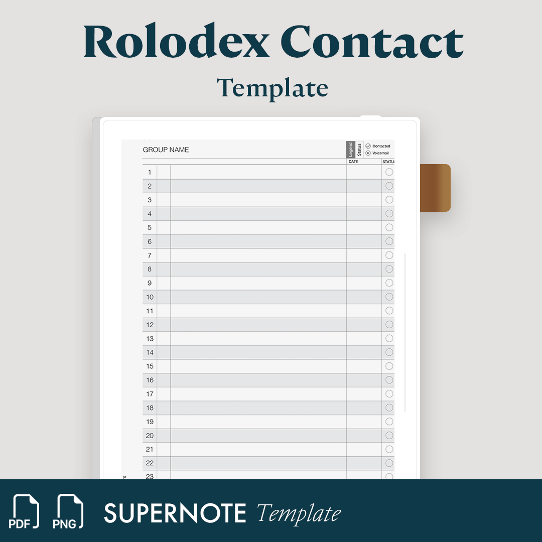 Let's face it, with our cell phone we have handed over our brain to our mobile phone. It thinks for us. Take back control of your network by writing down your contacts in this Rolodex style template for your Supernote tablet. It has been proven if we write it down we remember it better. This template also allows one to keep track of status, for example, things like when the contact was last called and whether or not a voicemail was sent or they were spoken too.